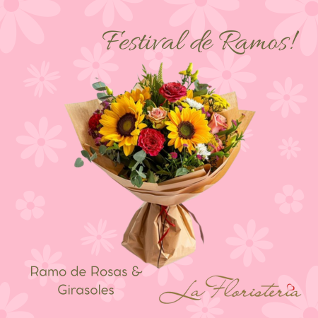 El encanto y la alegría de los Girasoles, acompañados de Rosas, Margaritas y fino follaje de vivero y envueltas en elegante paño.